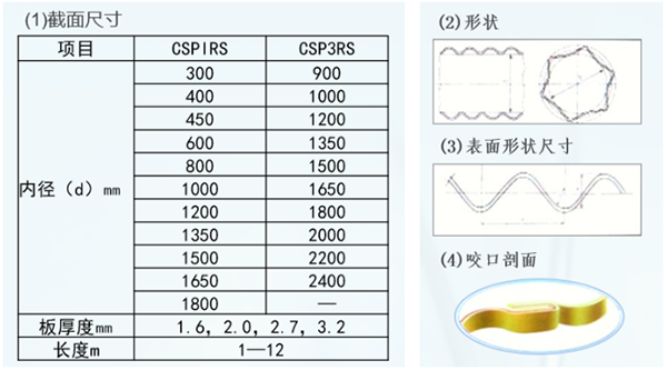 产品特点:高强度我公司生产的螺旋肋镀锌波纹钢管,采用独特的翻边压肋、滚压咬口工艺。在产品咬口处形成4倍于板材厚度的连续螺旋加强肋,既降低了产品重量又极大地提高了产品的刚性、柔性、抗拉和抗压强度。产品抗压强度是塑料管的3倍,是水泥管的1.5倍。